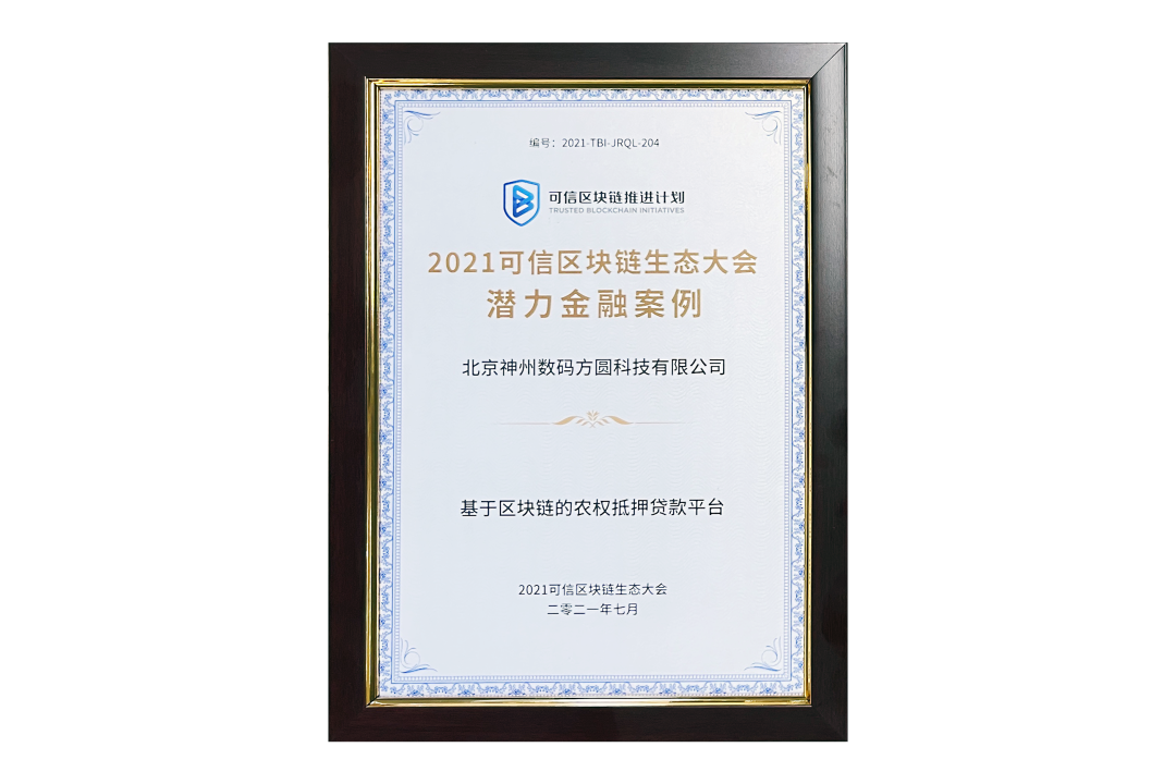 7月13日,由中国信息通信研究院、可信区块链推进计划主办的“2021可信区块链生态大会”在京举办,并隆重发布系列成果。神州信息子公司北京星空游戏方圆科技有限公司(简称:神州方圆)推荐的“基于区块链的农权抵押贷款平台”荣获十大金融应用高潜力案例,为“区块链+农业”落地带来示范效应。